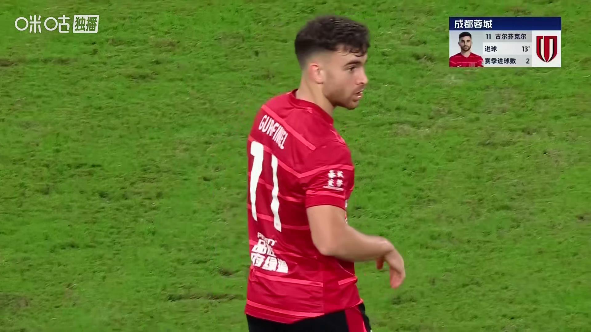 上半场开场成都蓉城便展开攻势,王东升第5分钟的射门偏出。紧接着第12分钟,古尔芬克尔前场得球后独闯禁区,小角度劲射破门打破僵局,成都蓉城1-0领先。